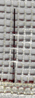 After finishing the basting, double-check your accuracy in both directions before proceeding to the cutting and only when you are certain, cut only the threads (always on the right of the fabric) which are left uncovered by the basting line both in the case of even and uneven numbers of holes.